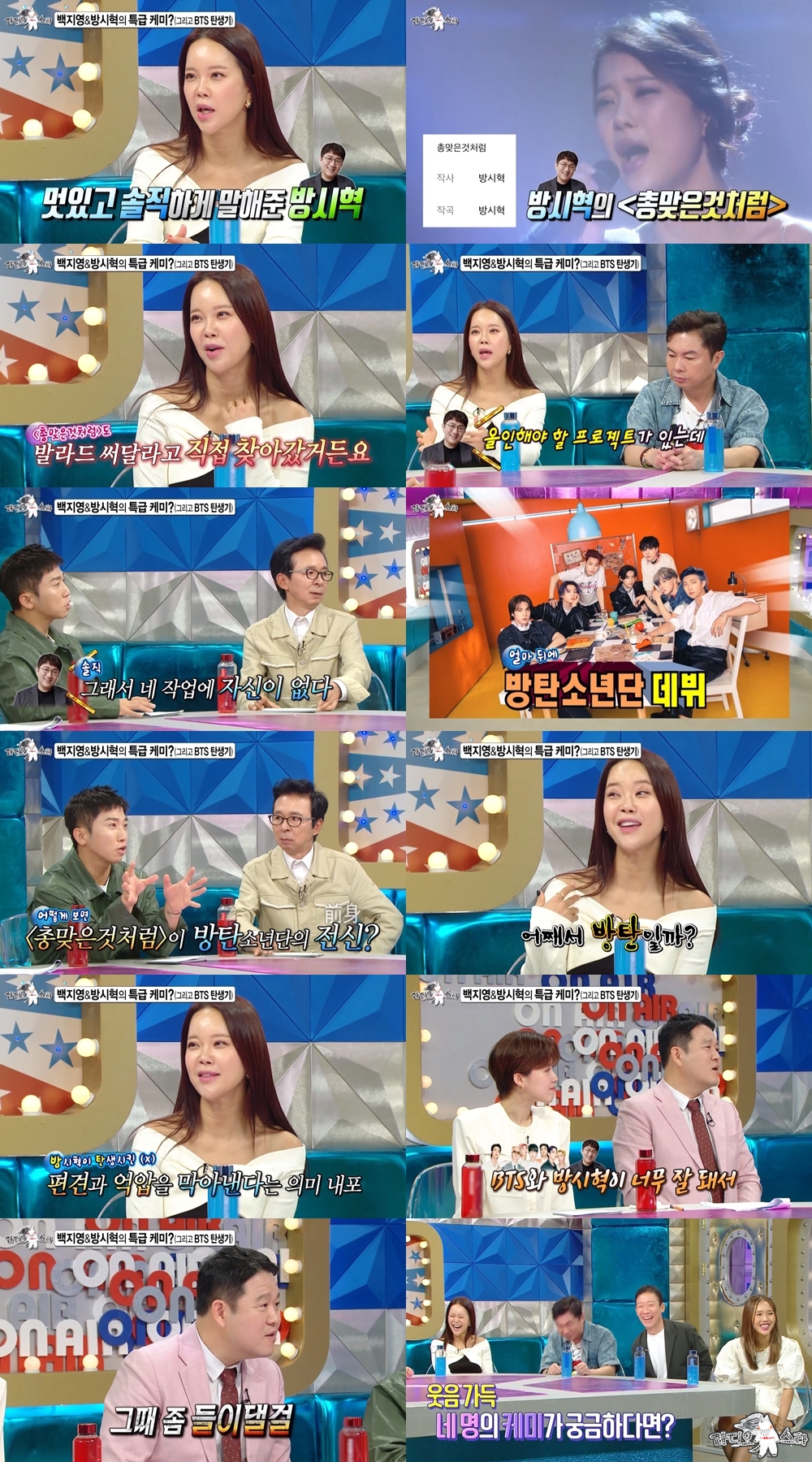 백지영 "방시혁 '총 맞은 것처럼' 이후 방탄소년단 나와"(라스) '라디오스타'에 출연한 가수 백지영이 방시혁(하이브 이사회 의장)이 작사, 작곡한 노래 '총 맞은 것처럼'의 탄생비화를 공개한다. 또 '총 맞은 것처럼'이 나온 뒤 방탄소년단이 나왔다는 사실에 'BTS의 전신 같은 ...