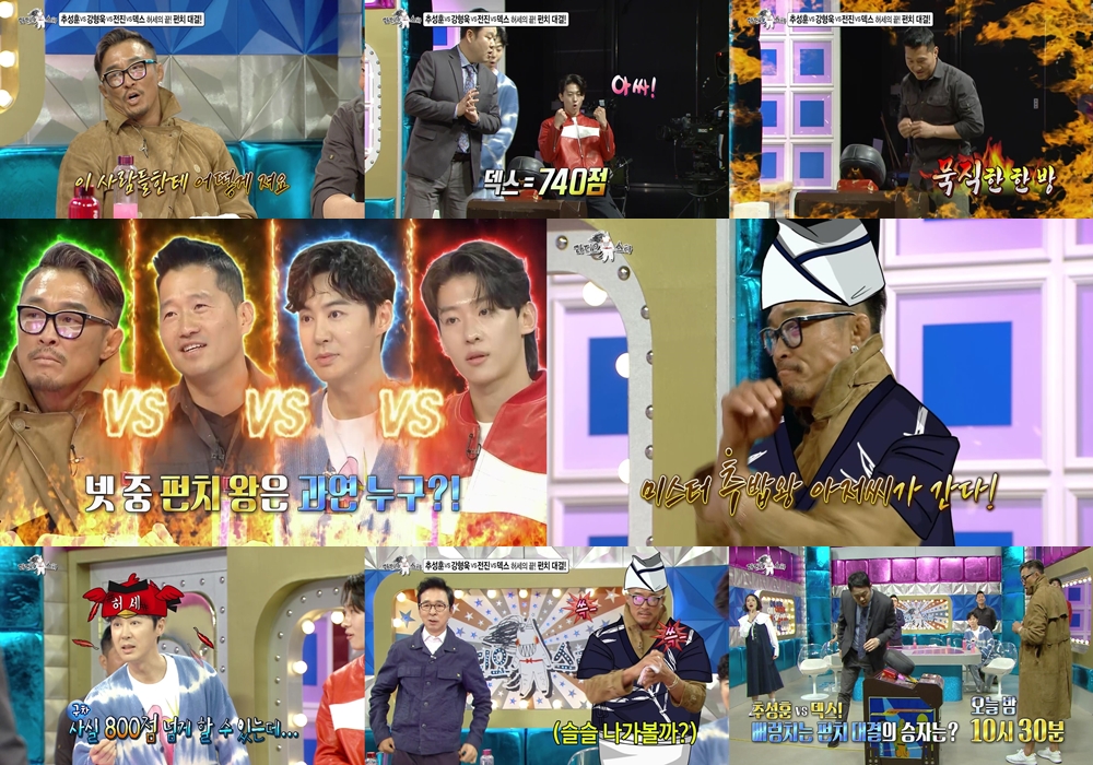'라스' 추성훈·강형욱·전진·덱스, 허세남들의 펀치 대결 개막 허세남 4인방 추성훈, 강형욱, 전진, 덱스의 펀치 대결이 '라디오스타'에서 열렸다. UDT 출신 덱스는 풀파워 스윙으로 최고점을 기록한 반면, 전진은 허세를 부리다 최하점의 굴욕을 맛봤다. 이 가운데 추성훈은 "제...
