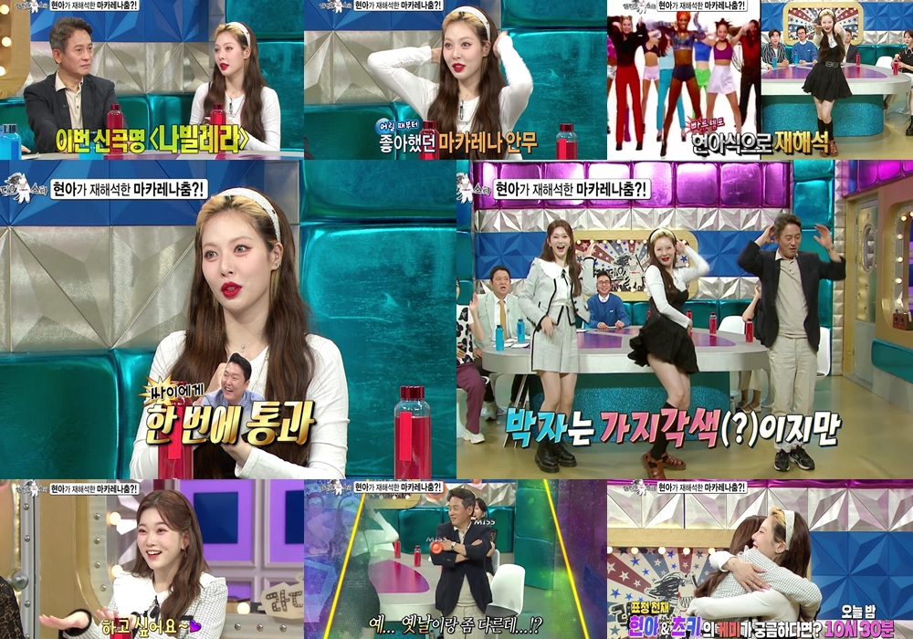 '라디오스타' 현아 "신곡에 마카레나 춤 넣고 싶었어" 가수 현아가 ‘라디오스타’에서 ‘국민 안무’로 불렸던 마카레나 춤을 재해석한 시선 강탈 신곡 안무를 공개했다. 그는 춤신 싸이로부터 한 번에 통과된 안무라고 밝혀 관심을 모았다. 이어 츠키, 김병옥과 함께 세대를 아...