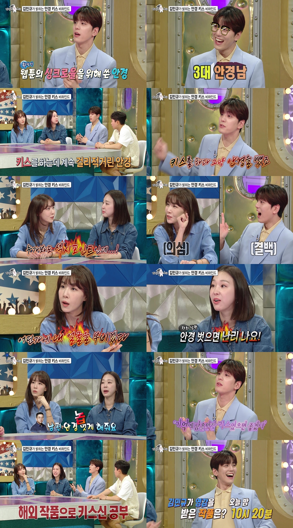 '라스' 김민규, 배용준·박신양 계보 잇는 3대 안경남 등극 '라디오스타' 김민규가 드라마 '사내맞선'에서 화제를 모은 안경 키스신이 즉석에서 나온 애드리브였다고 비하인드를 공개했다. 그는 불편해서 벗었다며 "기억에 남을 만한 키스신을 위해 해외 작품을 보고 공부했다"라고 이...
