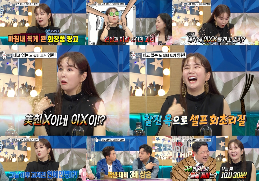 장영란, 화장품CF 앞두고 찰진 욕 급발진한 이유(라디오스타) 장영란이 '라디오스타'에 출연해 톱스타의 상징인 화장품 CF 촬영 전날 급발진하며 스스로 찰진 욕을 선물한 사연을 공개해 폭소를 자아냈다.