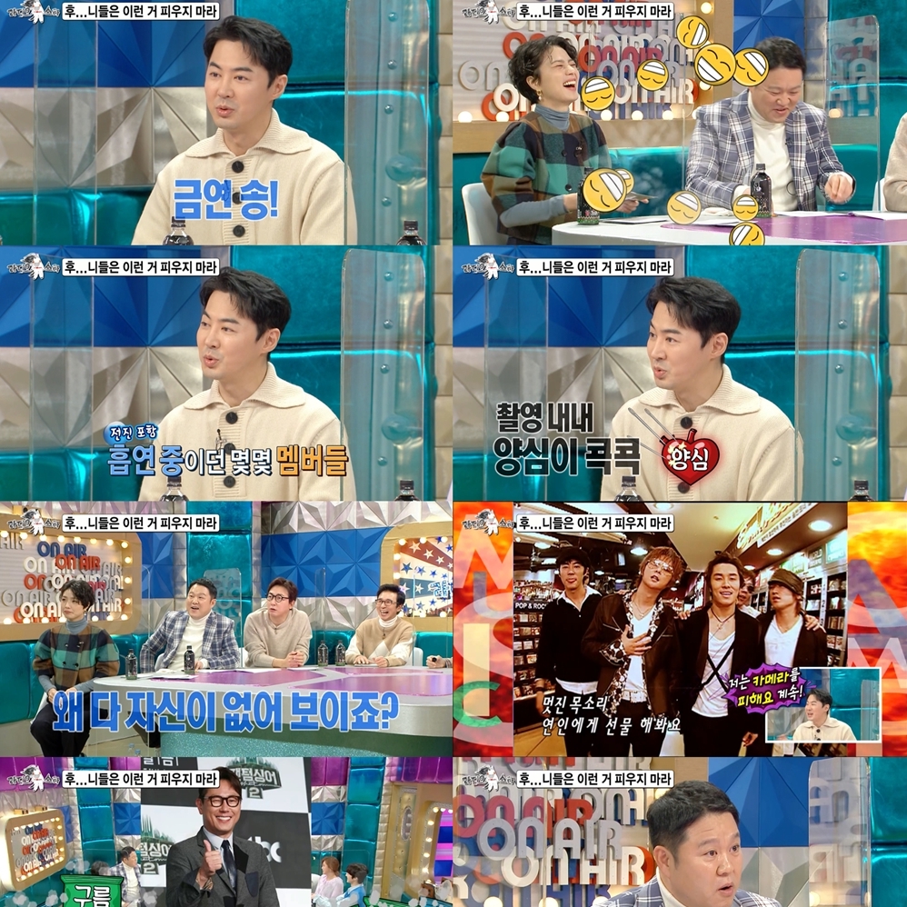 전진 "금연송 부를 당시 흡연, 당당하지 못했다" (라디오스타) 신화 전진이 ‘라디오스타’에 출연해 쭈뼛쭈뼛 카메라 뒤로 숨었던 비화를 공개했다. 멤버 일부가 애연가인 신화가 금연송 ‘폐의 하루’를 부르게 돼 민망함에 쭈뼛거리는 모습이 포착됐다.