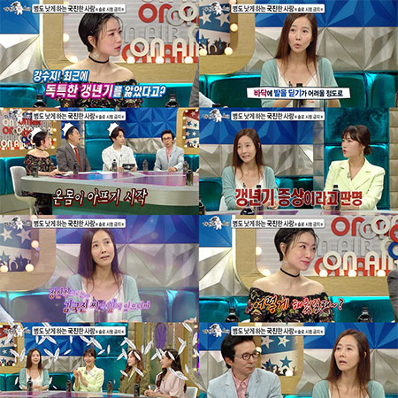 '라디오스타' 강수지, 알고보니 대식가? "저 많이 먹어요!" 마른 체질 유지비결은? 강수지가 작년에 겪었던 이상 증세를 호소한다. 움직일 수 없을 정도로 온몸이 아팠다는 그녀에게 무슨 일이 있었던 것인지, 이를 이겨낼 수 있었던 힘은 무엇인지 궁금증이 커진다.