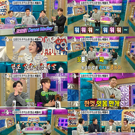 '라디오스타' 김종민, 언행 불일치 댄스에 '폭소'… "뭘 과시하고 싶은거야?" 가수 김종민이 ‘라디오스타’에 출연해 추억소환 코요태 명곡 댄스 메들리를 공개했다. 그는 특유의 시그니처 마무리 포즈와 함께 언행 불일치 댄스로 폭소를 유발했다.
