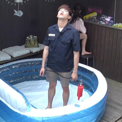 에릭남이 튜브 수영장에 바람을 넣다 기절 직전까지 간 모습이 포착돼 웃음을 주고 있다.