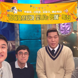 29일(수) 방송되는 MBC 예능프로그램 <라디오스타>에서는 '라디오스타가 빛나는 밤에' 특집으로 박중훈, 서장훈, 김흥국, 배순탁이 출연한다.