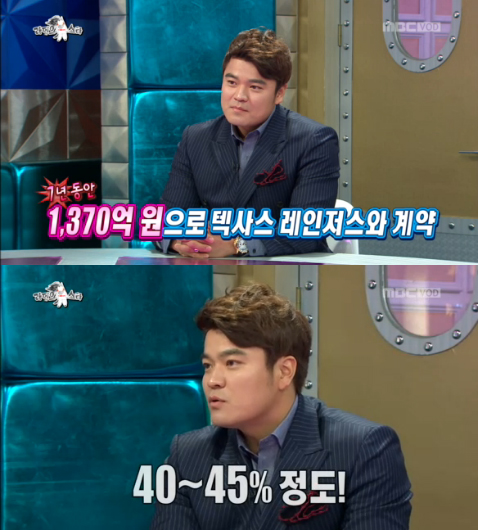 텍사스 레인저스와 1370억원의 계약을 체결하며 세간의 이목을 사로잡았던 추신수에게 MC들은 "더 높은 계약금을 제시했던 ...