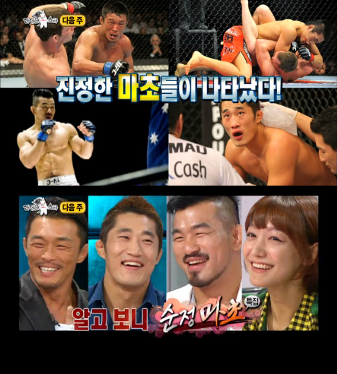 28일 방송될 MBC <황금어장-라디오스타>에서는 '순정마초 특집'으로 격투기 파이터 추성훈, 김동현, 배명호 그리고 격투기 마니아 신소율이 출연해 입담을 펼칠 예정이다.