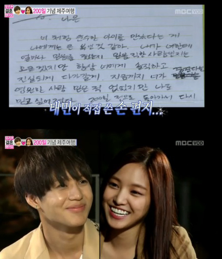 태민, 나은 위한 손편지! '나와 결혼해줄래?' 23일(토) 방송된 MBC <우리 결혼했어요-시즌4>에서는 태민이 나은에게 정성이 가득담긴 깜짝 손편지를 전달했다.