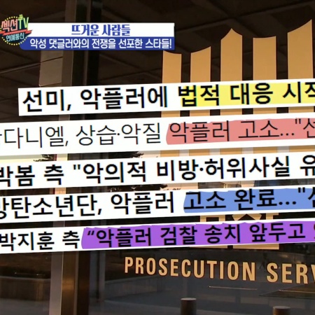 '섹션TV 연예통신' 악플러들과의 전쟁, 더 이상 선처 없는 스타들의 법적 대응! 네티즌들 지지 24일 방송된 ‘섹션TV 연예통신’에서는 악성 댓글과의 전쟁을 선포한 스타들의 소식을 전했다.