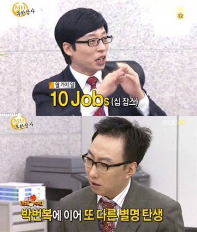 <무도> 박명수, 새 별명 '십잡스' 탄생! 한 달에 두 개씩 새 별명이 생기는 '별명의 대가' 박명수가 새해 첫 별명이 생겼다. 14일 방송된 <무한도전>은 '신년특집 무한상사'로 꾸며졌다. 지난해 인기를 얻은 '무한상사'의 종무식과 신년맞이에 관한 에피소드로 꾸며진 이 날 방송에선 박명수가 새...