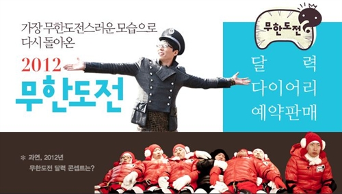 <무도> 2012 달력출시 소식에 네티즌들 너도나도 '주문완료' 2012 <무한도전> 달력의 예약판매가 시작되었다. 11월 18일(금)부터 MBC티숍, 인터넷 GSSHOP, d&shop에서 2012년 무한도전 달력과 다이어리가 예약판매되고 있다. 이는 <무한도전> '달력편' 방송 당일의 주문폭주로 인한 불편함을 미연에 방지하고자 실시된것...