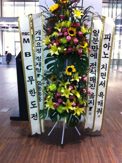 <무도> 정재형 콘서트에 센스화환, "개그요정 정재형!" <무한도전>이 정재형의 콘서트에 보낸 '센스화환'이 화제가 되고있다. 10월 6일 정재형의 소속사 사장이 자신의 트위터에 "'무한도전' 고마워요!!!"라는 글과 함께 화환 사진을 올렸다. 사진에는 네 개나 되는 리본에 "피아노 치면서 욕해줘", "일분만에 전석...