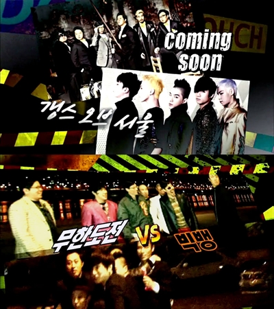 <무도> vs 빅뱅 '갱스 오브 서울' 특집! <무한도전> 빅뱅 출연 소식으로 이미 화제가 된 ‘갱스 오브 서울’의 예고편이 드디어 전파를 탔다. 23일 방송된 MBC TV <무한도전>에서는 아이돌 그룹 빅뱅이 특별 출연하는 '갱스 오브 서울' 특집 예고편이 방송 말미에 공개됐다.