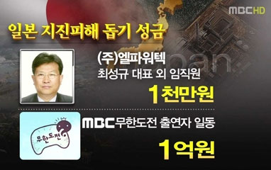 <무한도전> 일본 지진피해 성금 1억원 기부! MBC 간판 예능 프로그램 <무한도전> 출연진이 일본 지진피해 성금으로 1억원을 기부했다.