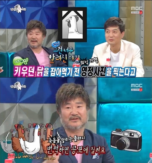 배우 이계인이 직접 기른 닭을 잡아먹기 전 영정사진을 찍는다는 독특한 습관에 대해 밝혔다.