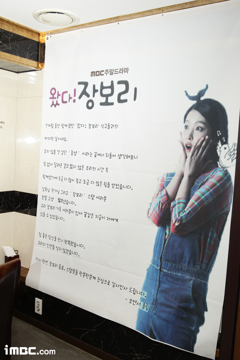 7일 iMBC 공식홈페이지는 6일 여의도 모처에서 진행된 <왔다! 장보리> 종방연 현장이 담긴 사진을 공개했다. 시청률 40% 돌파를 앞두고 있는 국민 드라마답게 종영을 축하하는 3단 케이크가 현장의 중심을 지키고 있었으며, 타이틀롤 오연서가 스태프들에게 보내는 편지가 한쪽 벽면에 자리해 눈길을 끌었다. 화기애애한 분위기 속에 시즌2 제작해야 하는 것 아니냐는 우스갯소리가 나오기도 했다.