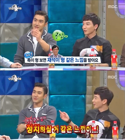 MC 윤종신은 "재석이가 얼마나 웃긴데"라고 말하자 규현은 "그럼 재미없는 재석이 형"이라면서 한 발 물러섰다. 이에 MC 김구라는 "그럼 염경환"이라면서 유재석이 재밌다고 칭찬하다 시원은 뜬금없이 "재석이 형은 정치할 것 같다"고 발언했다. MC들이 황당해하자 시원은 "빈틈이 없고, 제가 아파트 옆 동에 살고 있는데 아파트 경비분들 이름까지 외우고 안부인사를 건네는 모습을 보고 그런 생각이 들었다"면서 유재석의 평소 모습에 대해 전했다.