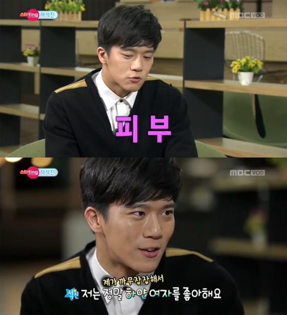 평소 굴욕 셀카를 가감없이 SNS에 공개하면서 가식없는 솔직남으로 등극한 하석진은 이날 리포터 박슬기의 "좋아하는 이성상의 어떤 부분을 먼저 보는가"라는 질문에 "피부"라고 답했다.