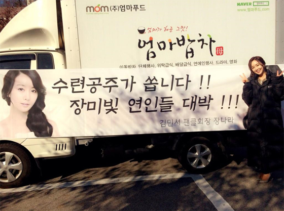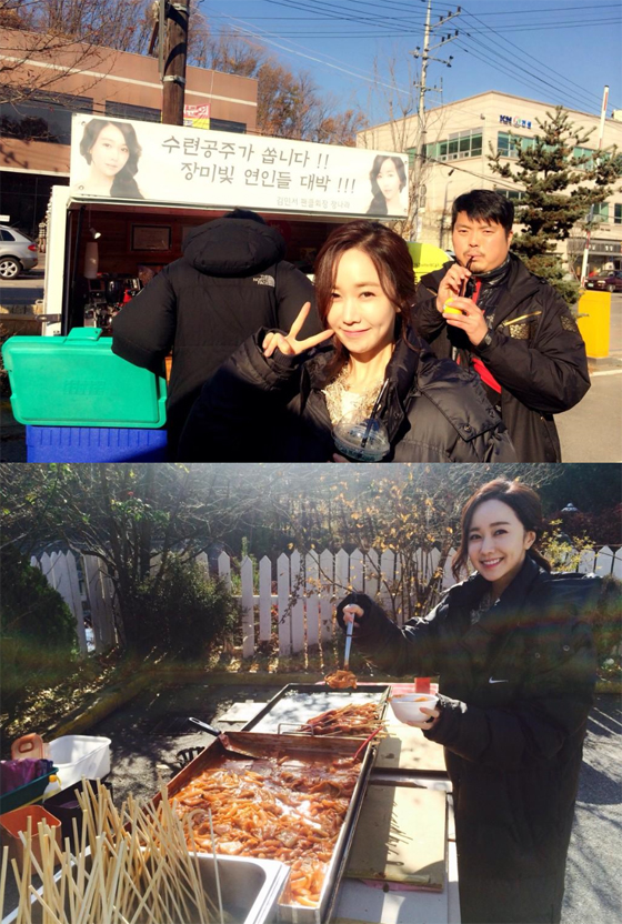 '수련공주가 쏩니다! 장미빛 연인들 대박!'이라는 플랜카드와 함께 하단에 '김민서 팬클럽 회장 장나라'라는 깨알같은 문구를 넣고, 김민서를 비롯한 배우와 제작진들에게 따뜻한 분식차를 선물한 주인공은 다름아닌 배우 장나라.