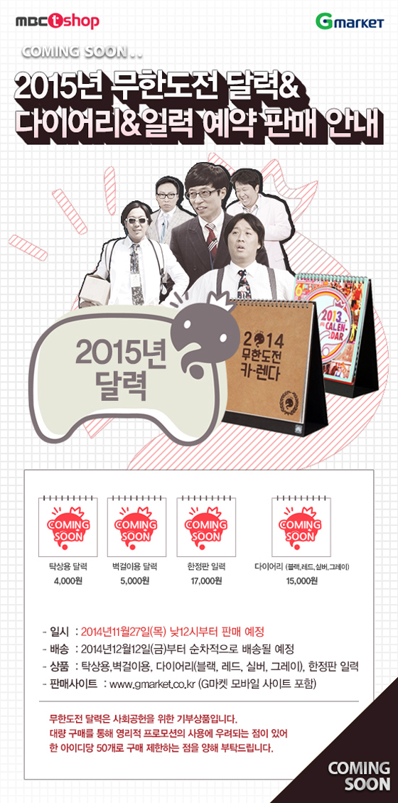 2015년 <무한도전> 달력 및 다이어리가 오는 11월 27일(목) 정오부터 MBC TShop과 G마켓을 통해 예약 판매에 들어간다.