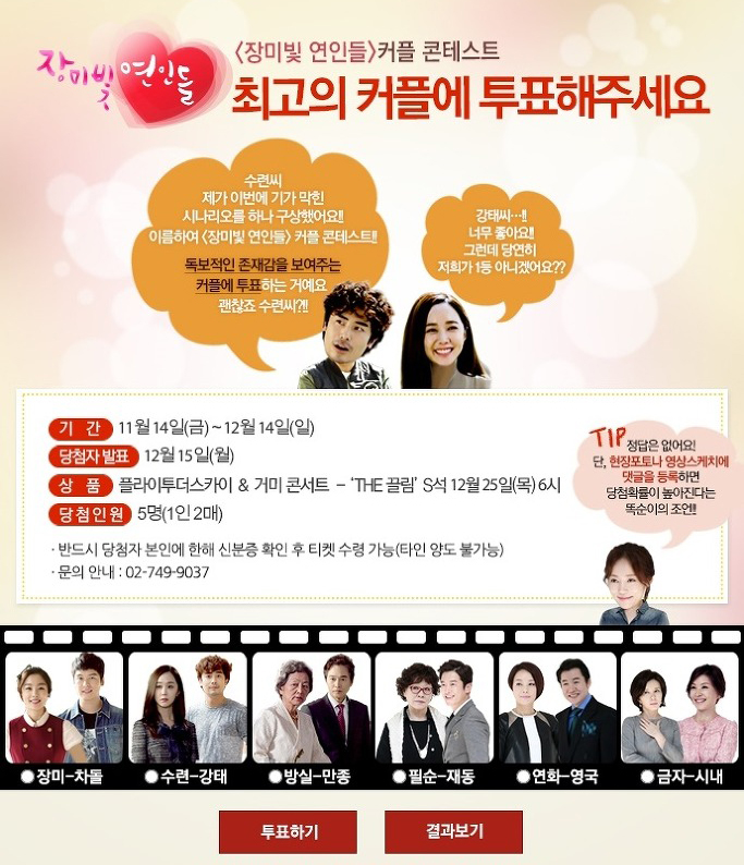 iMBC <장미빛 연인들> 공식 홈페이지에서는 11월 14일(금)부터 12월 14일(일)까지 드라마 속 최고의 커플을 뽑는 설문조사를 진행했다. 세 가족의 이야기를 다룬 독특한 구성답게 다양한 인간상을 보여주고 있는 <장미빛 연인들> 속에는 환상의 궁합을 자랑하는 짝꿍들이 각축을 벌이고 있다.