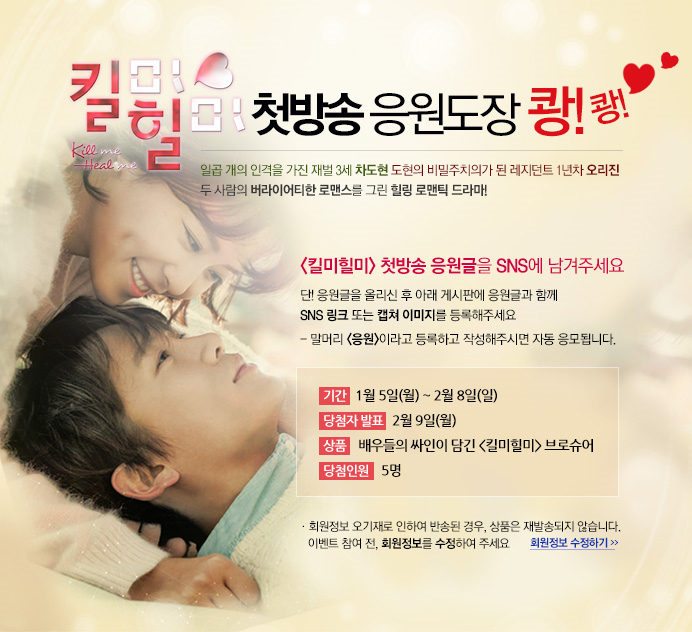 <킬미, 힐미>의 응원글을 자신의 SNS에 남겨 응모하면, 추첨을 통해 5명에게 배우들의 싸인이 담긴 브로슈어를 증정하는 형태다. 참여는 1월 5일(월)부터 2월 8일(일)까지 iMBC 공식홈페이지를 통해 가능하며, 당첨자는 2월 9일(월)에 발표된다.