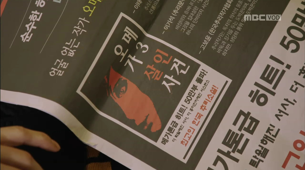 수많은 평론가들과 추리작가들의 극찬이 줄줄이 나열되어있는 이 신문 속 소설. 하지만 실제는 없는 것으로 확인됐다. 그렇다면, 우리는 극중 추리소설 작가로 등장하는 리온이 쓴 저서가 바로 이 '오메가3 살인사건'이라는 사실을 조심스럽게 유추해볼 수 있다.