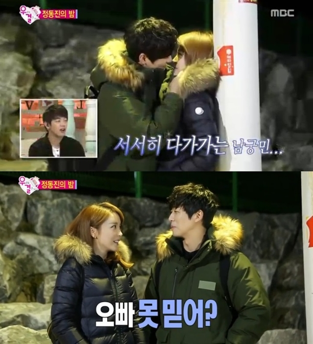 틈만나면 키스신을 연출하는 남궁민-홍진영 커플의 두 번째 키스 장소는 정동진이 될까? MBC 예능프로그램 <우리 결혼했어요>는 매주 토요일 오후 5시에 방송된다.