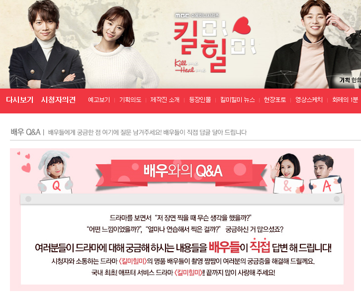 5일(목) MBC 수목미니시리즈 <킬미, 힐미>가 공식 홈페이지의 '배우와의 Q&A'란을 통해 배우와 드라마 팬들이 직접 만날 수 있는 소통의 장을 마련하면서 화제다.