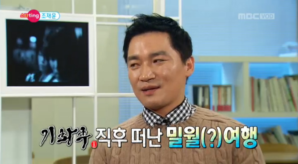 이어 "어느 날 TV를 보는데 쇼핑 채널에서 그 친구의 얼굴이 유난히 예뻐보여서 고백했는데, '왜 이러냐'라며 매몰차게 차였다. 하지만 그후에 3주 정도 있다가 함께 밀월 여행을 갔다"라며, 세간의 속도위반 결혼에 대한 질문에 대해서 오히려 "아이가 혹시 들어섰나 궁금하다"라고 대답해 웃음을 자아냈다.