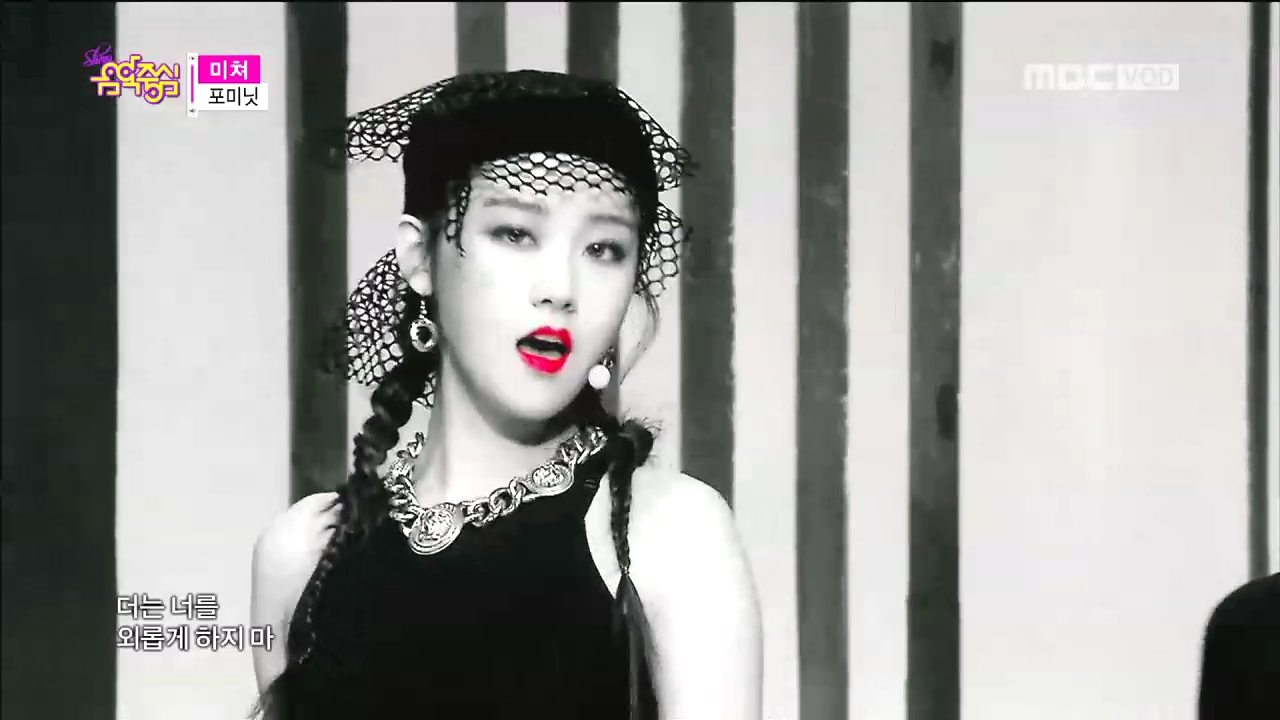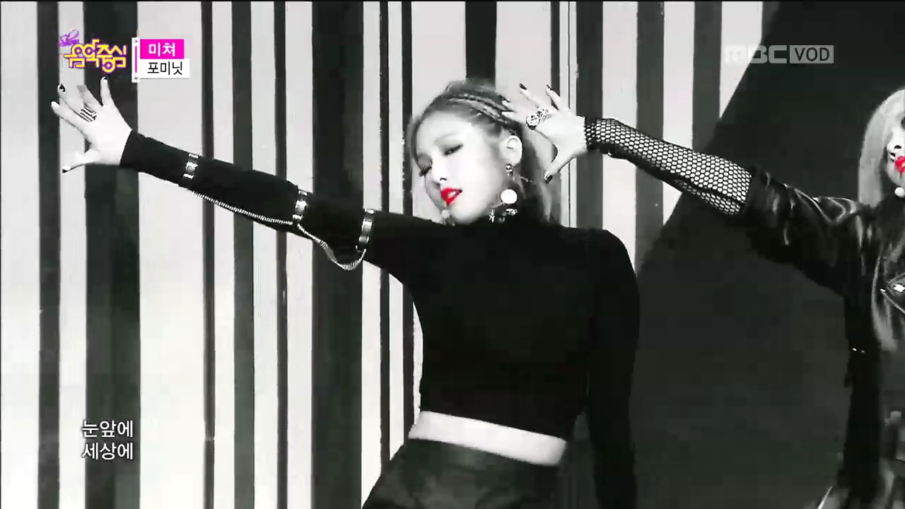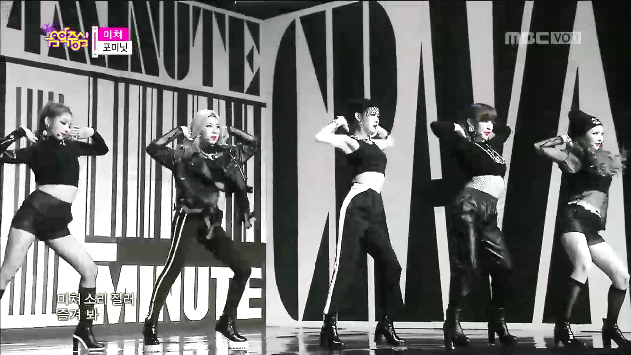 14일(토) MBC <쇼! 음악중심>에 출연한 포미닛은 새 앨범 수록곡 '1절만 하시죠'와 '미쳐'의 무대를 선보였다. 블랙 의상과 강렬한 레드립이 대비되며 독특한 화면 전환을 통해 꾸며진 무대는 포미닛의 개성을 고스란히 드러내며 성공적인 컴백무대를 완성했다.