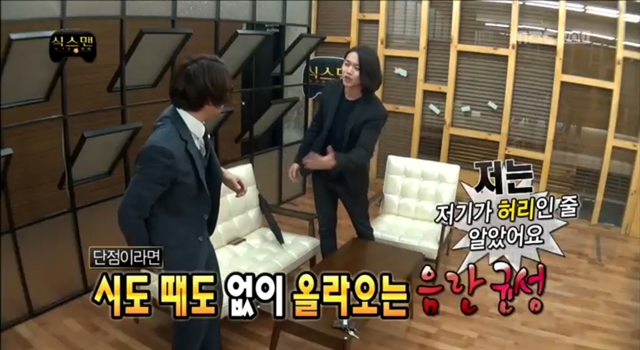 이에 하하는 흥분한 강균성에서 평소 흥분을 가라앉히는 방법을 물었고 이에 강균성은 19금 팔굽혀펴기를 선보여 하하를 충격에 빠지게 만들었고 이어 하동균과 저팔계가 합쳐진 성대모사를 선보여 웃음을 자아냈다.
