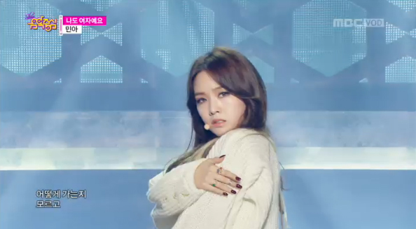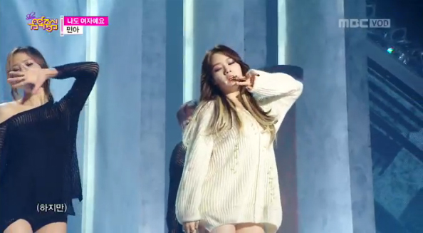 21일 방송된 MBC <쇼! 음악중심>에서는 걸스데이의 멤버에서 솔로곡 "나도 여자예요"로 돌아온 민아가 파격적인 하의실종 패션을 선보였다.
