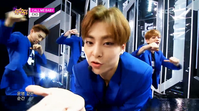 EXO는 이날 블랙&블루 슈트를 입고 신곡 'EXODUS'와 'CALL ME BABY'를 부르며 카리스마 넘치는 퍼포먼스를 펼쳐 단숨에 눈길을 사로잡았다. 특히 책상과 쇼파 등 가구를 활용한 안무와 동선에 따라 달라지는 안무대열로 역동적인 무대를 꾸며낸 것도 주목해 볼만하다.