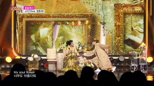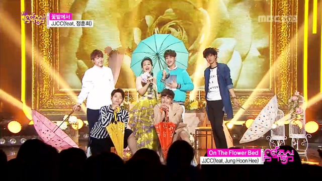 그리고 잠시 후, JJCC 멤버 다섯 명이 등장해 로맨틱한 우산 퍼포먼스와 함게 경쾌한 멜로디와 랩으로 리메이크한 '꽃밭에서'를 불러 시청자들에게 반전 무대를 선사했다.