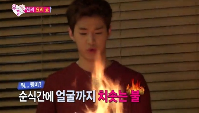 헨리는 능숙한 칼질에 이어 ‘불쇼’를 연출했고, 예상치 않게 크게 솟아오른 불길에 앞머리와 눈썹이 타는 사고가 발생했다.