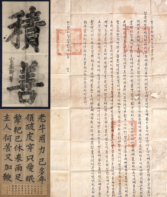 | (왼쪽 위부터 시계방향으로)선조의 어필, 선조의 국문교서, 인목왕후의 시. ©문화콘텐츠닷컴 |