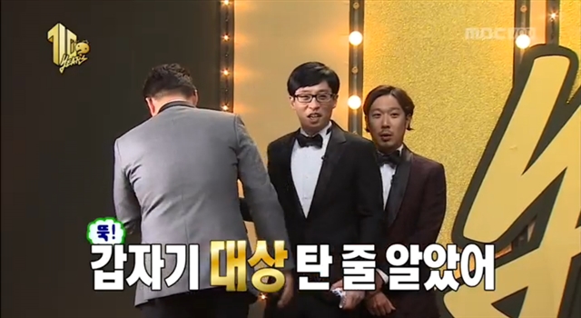 이에 당황한 유재석은 "갑지기 대상 탄 줄 알았어요. 지난 주 회식 때도 눈물을 흘렸어요"라며 너스레를 떨며 정준하를 흉내내자 하하는 "그 와중에 군만두를 탕수육에 찍어 먹더라고"라고 폭로해 웃음을 자아냈다.