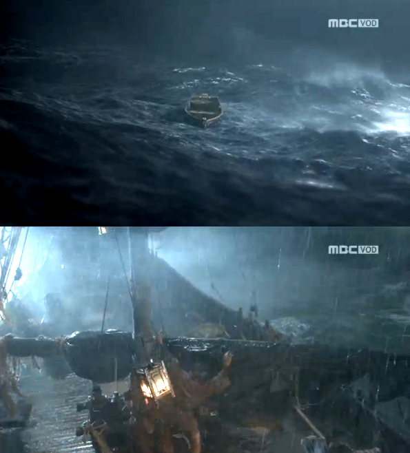 이날 정명공주가 칠흑 같은 밤바다에서 태풍을 만나고 노예선으로 옮겨지는 과정이 마치 실제 바다에서 촬영한 듯 장엄하고 역동적이었다.