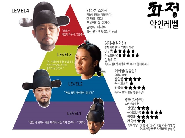이에, <화정>측이 공개한 악인 레벨은 1~4까지 나눠져 있으며 잔인함, 두뇌회전력, 권력욕 3개 부문으로 정리돼있어 눈길을 사로잡는다.