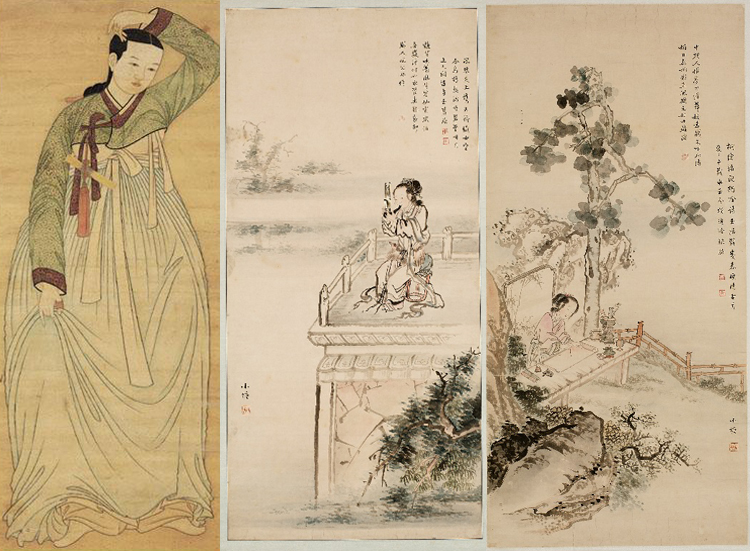 左출처미상미인도 ©문화재청 / 右이재관의 글을 쓰는 미인, 피리부는 미인 ©국립중앙박물관 당대 화가들의 그림 속에 드러나는 조선시대의 전형적인 미인상은 가늘고 긴 눈썹에 맑고 고운 눈, 붉고 매혹적인 입술, 복스럽게 둥글고 야위지 않은 얼굴 등의 공통점이 있다. |