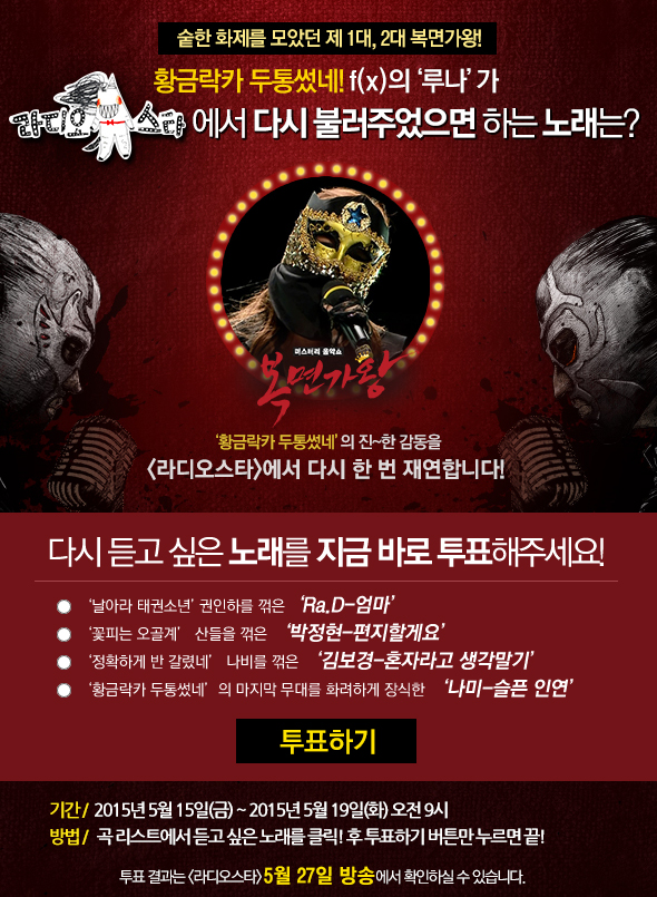 15일(금) <라디오스타> 측이 공식 홈페이지를 통해 “숱한 화제를 모았던 제 1, 2대 복면가왕 ‘황금락카 두통썼네’ f(x) 루나가 다시 불러주었으면 하는 노래는?”이라는 내용과 함께 시청자들이 이를 직접 투표할 수 있는 투표 페이지를 열었다.