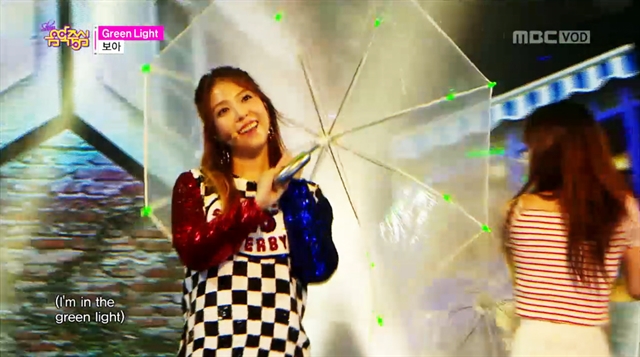 특히 'Green Light'를 부를 때는 투명한 우산을, 타이틀곡 'Kiss My Lips'를 부를 때는 풍성한 깃털장식의 파란색 부채를 들고 등장해 퍼포먼스의 여왕답게 화려한 무대를 선보이며 지켜보던 시청자들을 감탄케 했다.