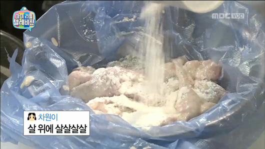 4. 닭고기 위에 또 한번 튀김가루를 뿌린다.