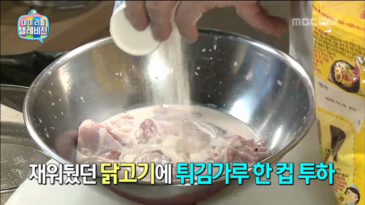 2. 지팡이 할아버지 치킨 맛의 비밀인 '맛소금'을 밥수저 반숟갈을 넣어 밑간을 한다.