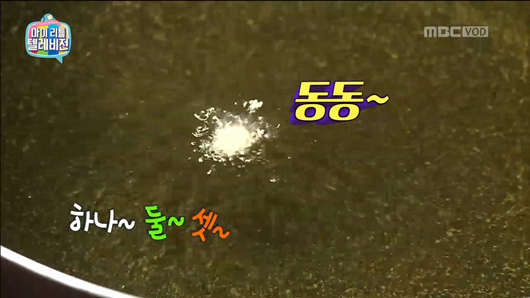 6. 튀김반죽을 작게 뭉쳐 끓는 기름 속에 넣고 '셋'을 센 후 반죽이 떠오르면 딱 맞는 온도!