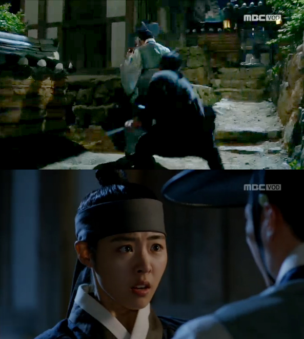 이어 밤중에 홀로 돌아다니며 생각에 잠긴 정명을 노리는 의문의 자객들이 갑자기 습격을 해왔고, 이를 마침 보게 된 주원은 정명을 감싸주면서 대신 상처를 입었다.