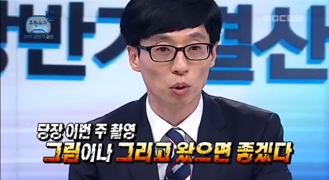 이에 유재석은 "그래서 지금 이자리에서 직접 그림을 부탁드려보겠습니다"라며 정준하에게 종이를 내밀어 본인과 멤버들을 놀라게 만들었고 이어 "당장 이번 주 촬영 그림이나 그리고 왔으면 좋겠어요"라는 제작진의 말을 전해 웃음을 자아냈다.