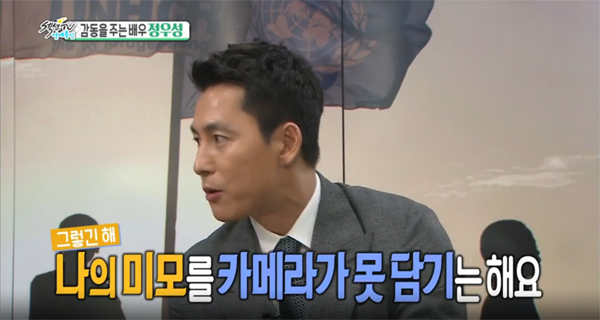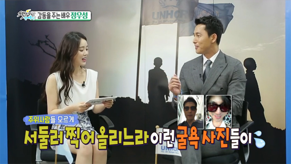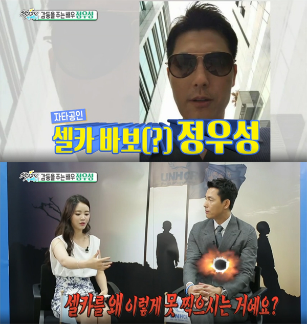 이날 UN난민기구 친선대사로 시청자들에게 인사를 건넨 정우성은 자타공인 ‘셀카 바보(?)’라는 호칭과 더불어 ‘외모에 비해 사진을 못 찍는다’는 주위의 평에 “일단 셀카 찍는 것을 별로 좋아하지 않는다”며 소감을 밝혔다. 이어 예쁘게 나오는 각오를 찾기 위해서 이리저리 움직이는 것이 다소 쑥스럽다고 전했다.